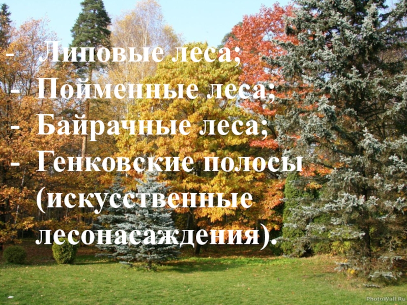 -  Липовые леса;Пойменные леса;Байрачные леса;Генковские полосы  (искусственные     лесонасаждения).