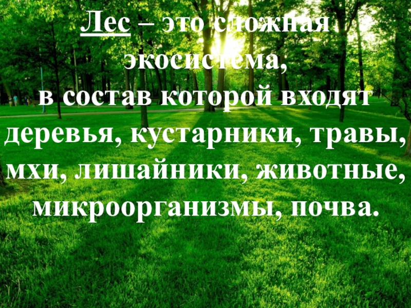 Лес – это сложная экосистема,в состав которой входят деревья, кустарники, травы, мхи, лишайники, животные, микроорганизмы, почва.