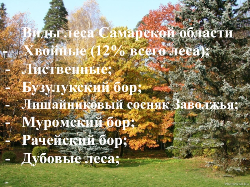 Виды леса Самарской области-  Хвойные (12% всего леса);Лиственные;Бузулукский бор;Лишайниковый сосняк Заволжья;Муромский бор;Рачейский бор;Дубовые