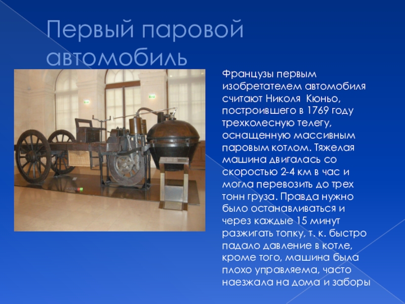 1769 году трехколесную телегу, оснащенную массивным паровым котлом. Тяжелая машина двигалась со скоростью 2-4 км в час и могла перевозить до трех тонн груза. Правда нужно было останавливаться и через каждые 15 минут разжигать топку, т. к. быстро падало давление в котле, кроме того, машина была плохо управляема, часто наезжала на дома и заборы