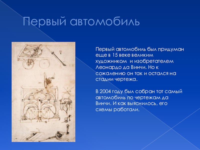 Первый автомобильПервый автомобиль был придуман еще в 15 веке великим художником и изобретателем Леонардо да Винчи. Но к сожалению он так и остался на стадии чертежа.В 2004 году был собран тот самый автомобиль по чертежам да