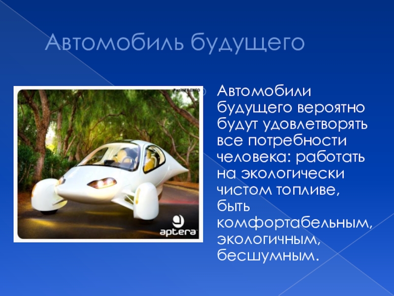 Автомобиль будущегоАвтомобили будущего вероятно будут удовлетворять все потребности человека: работать на экологически чистом топливе, быть комфортабельным, экологичным,
