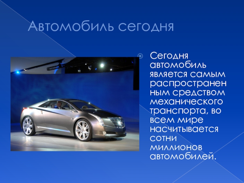 Автомобиль сегодняСегодня автомобиль является самым распространенным средством механического транспорта, во всем мире насчитывается сотни миллионов автомобилей.