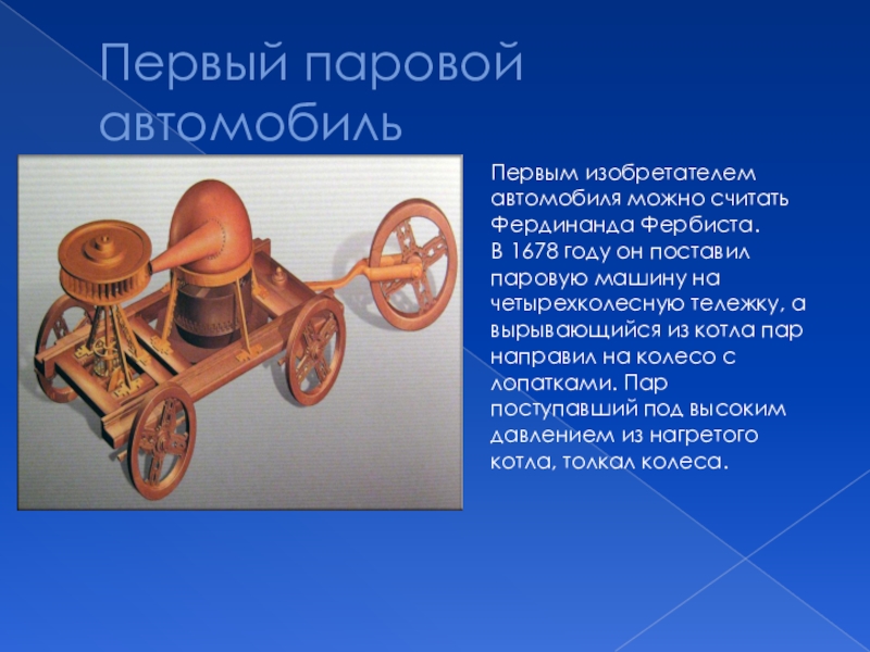 Первый паровой автомобильПервым изобретателем автомобиля можно считать Фердинанда Фербиста.В 1678 году он поставил паровую машину на четырехколесную