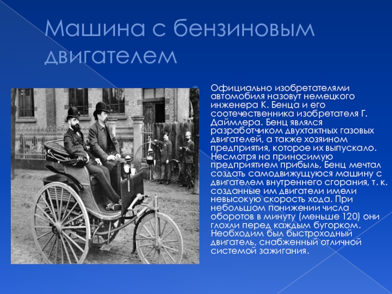 и его соотечественника изобретателя Г. Даймлера. Бенц являлся разработчиком двухтактных газовых двигателей, а также хозяином предприятия, которое их выпускало. Несмотря на приносимую предприятием прибыль, Бенц мечтал создать самодвижущуюся машину с двигателем внутреннего сгорания, т. к. созданные им двигатели имели невысокую скорость хода. При небольшом понижении числа оборотов в минуту (меньше 120) они глохли перед каждым бугорком. Необходим был быстроходный двигатель, снабженный отличной системой зажигания.