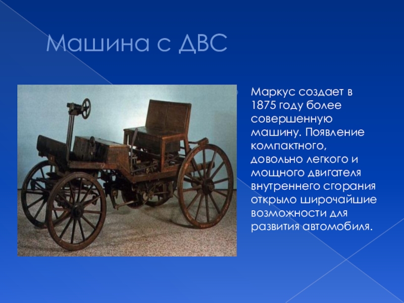 Машина с ДВСМаркус создает в 1875 году более совершенную машину. Появление компактного, довольно легкого и мощного двигателя