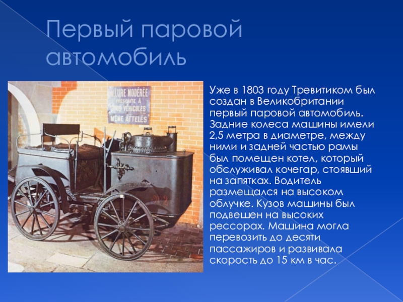 первый паровой автомобиль. Задние колеса машины имели 2,5 метра в диаметре, между ними и задней частью рамы был помещен котел, который обслуживал кочегар, стоявший на запятках. Водитель размещался на высоком облучке. Кузов машины был подвешен на высоких рессорах. Машина могла перевозить до десяти пассажиров и развивала скорость до 15 км в час.