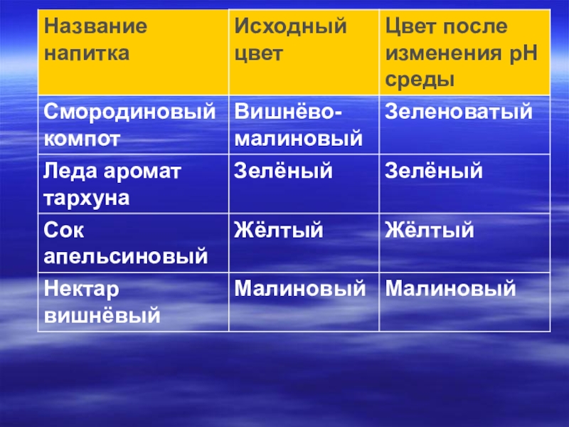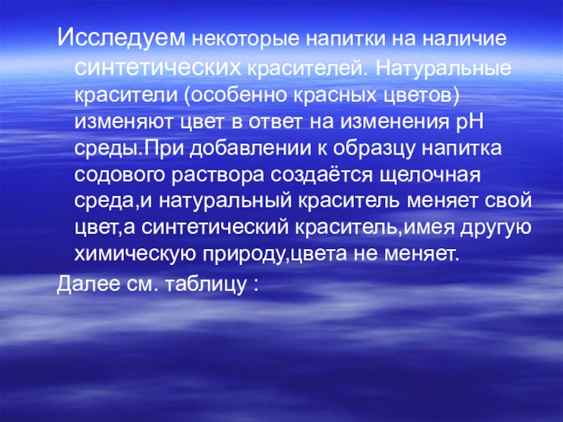 цветов) изменяют цвет в ответ на изменения pH среды.При добавлении к образцу напитка содового раствора создаётся щелочная среда,и натуральный краситель меняет свой цвет,а синтетический краситель,имея другую химическую природу,цвета не меняет.
