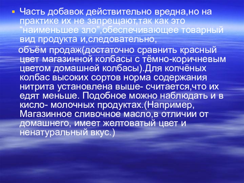 объём продаж(достаточно сравнить красный цвет магазинной колбасы с тёмно-коричневым цветом домашней колбасы).Для копчёных колбас высоких сортов норма содержания нитрита установлена выше- считается,что их едят меньше. Подобное можно наблюдать и в кисло- молочных продуктах.(Например,Магазинное сливочное масло,в отличии от домашнего, имеет желтоватый цвет и ненатуральный вкус.)