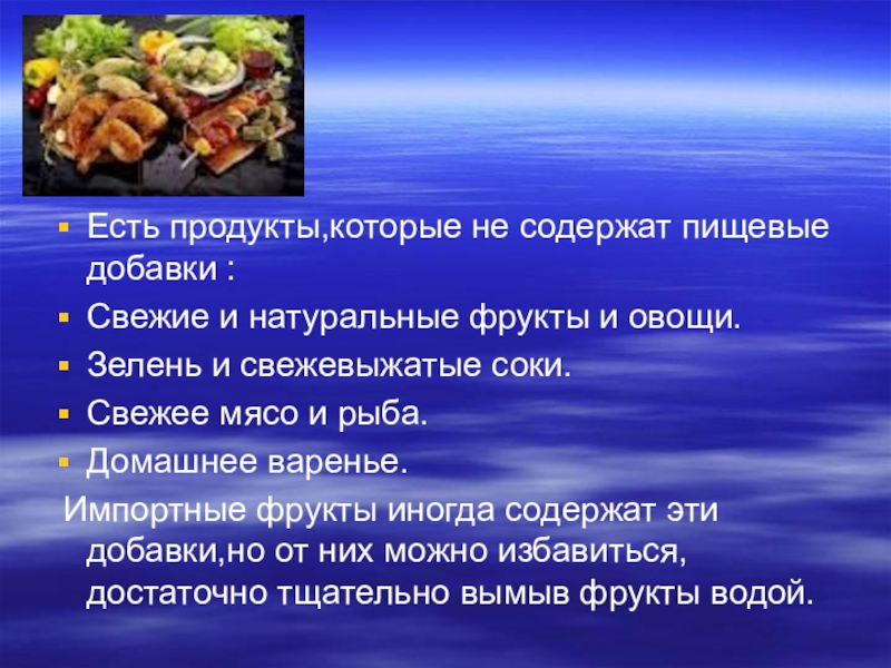 Импортные фрукты иногда содержат эти добавки,но от них можно избавиться,достаточно тщательно вымыв фрукты водой.