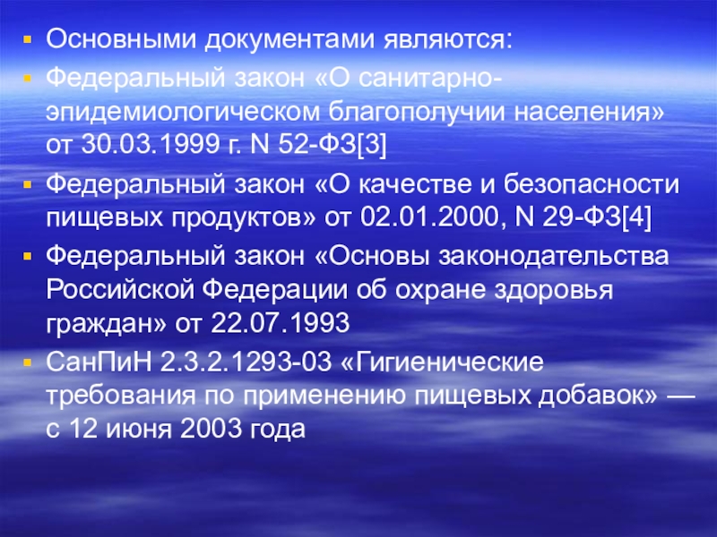 СанПиН 2.3.2.1293-03 «Гигиенические требования по применению пищевых добавок» — c 12 июня 2003 года