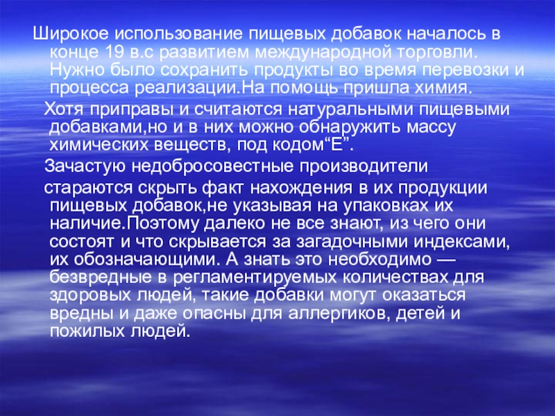 Слайд 4 Широкое использование пищевых добавок началось в конце 19 в.с развитием