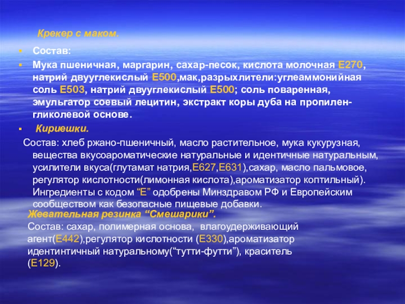 Е270,натрий двууглекислый Е500,мак,разрыхлители:углеаммонийная соль Е503, натрий двууглекислый Е500; соль поваренная, эмульгатор соевый лецитин, экстракт коры дуба на пропилен-гликолевой основе.
