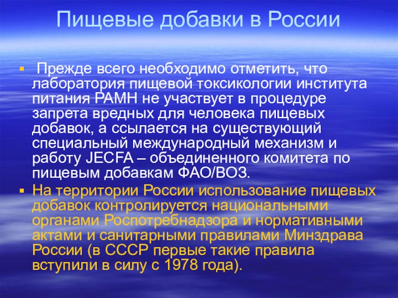 токсикологии института питания РАМН не участвует в процедуре запрета вредных для человека пищевых добавок, а ссылается на существующий специальный международный механизм и работу JECFA – объединенного комитета по пищевым добавкам ФАО/ВОЗ.