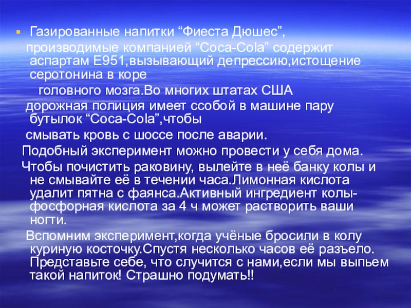 Вспомним эксперимент,когда учёные бросили в колу куриную косточку.Спустя несколько часов её разъело. Представьте себе, что случится с нами,если мы выпьем такой напиток! Страшно подумать!!
