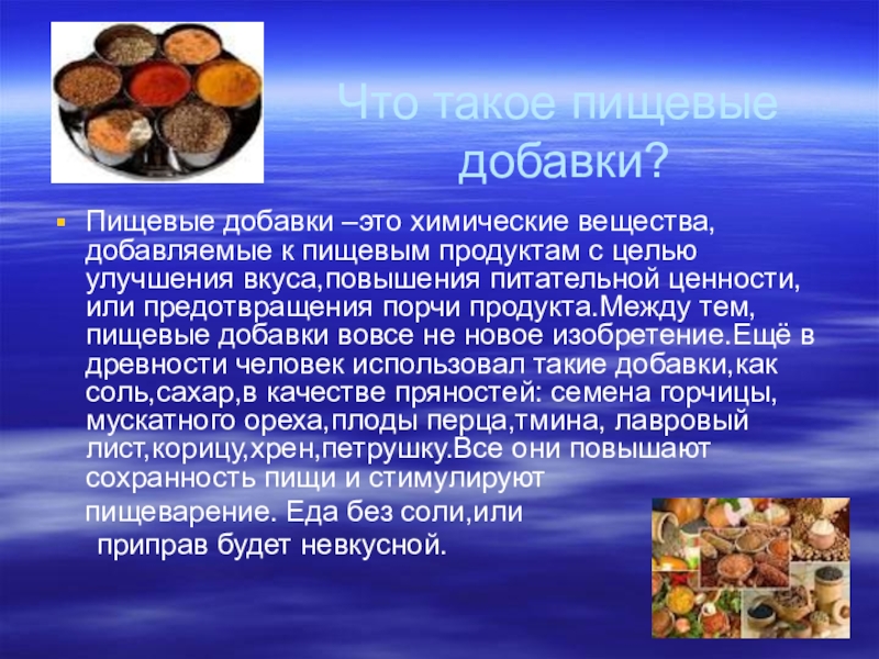 с целью улучшения вкуса,повышения питательной ценности,или предотвращения порчи продукта.Между тем,пищевые добавки вовсе не новое изобретение.Ещё в древности человек использовал такие добавки,как соль,сахар,в качестве пряностей: семена горчицы, мускатного ореха,плоды перца,тмина, лавровый лист,корицу,хрен,петрушку.Все они повышают сохранность пищи и стимулируют