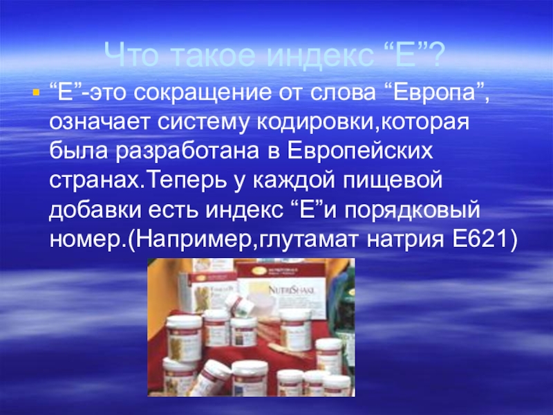была разработана в Европейских странах.Теперь у каждой пищевой добавки есть индекс “Е”и порядковый номер.(Например,глутамат натрия Е621)