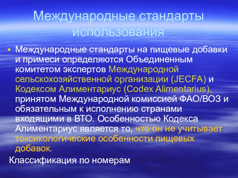 Объединенным комитетом экспертов Международной сельскохозяйственной организации (JECFA) и Кодексом Алиментариус (Codex Alimentarius), принятом Международной комиссией ФАО/ВОЗ и обязательным к исполнению странами входящими в ВТО. Особенностью Кодекса Алиментариус является то, что он не учитывает токсикологические особенности пищевых добавок.