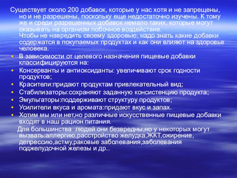 но и не разрешены, поскольку еще недостаточно изучены. К тому же и среди разрешенных добавок немало таких, которые могут оказывать на организм побочное воздействие.
