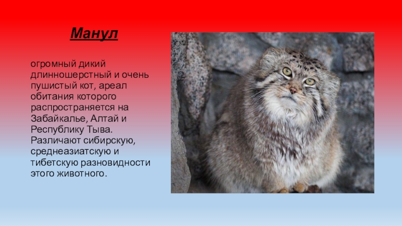 очень пушистый кот, ареал обитания которого распространяется на Забайкалье, Алтай и Республику Тыва. Различают сибирскую, среднеазиатскую и тибетскую разновидности этого животного.