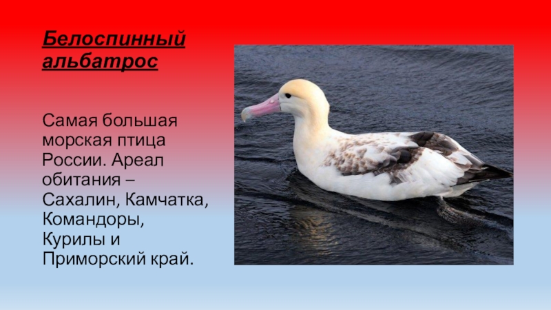 Самая большая морская птица России. Ареал обитания – Сахалин, Камчатка,