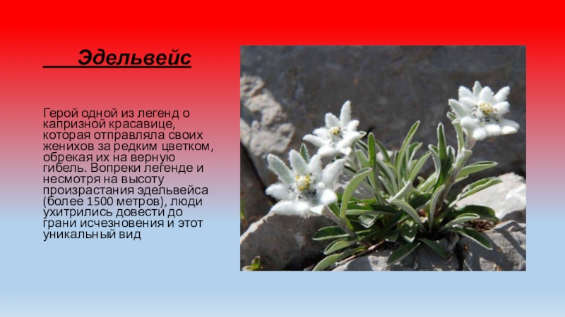 которая отправляла своих женихов за редким цветком, обрекая их на верную гибель. Вопреки легенде и несмотря на высоту произрастания эдельвейса (более 1500 метров), люди ухитрились довести до грани исчезновения и этот уникальный вид