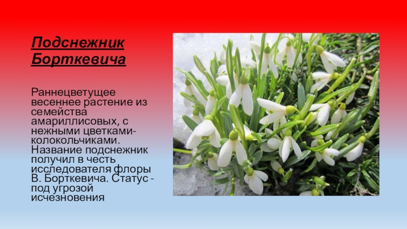 Название подснежник получил в честь исследователя флоры В. Борткевича. Статус - под угрозой исчезновения