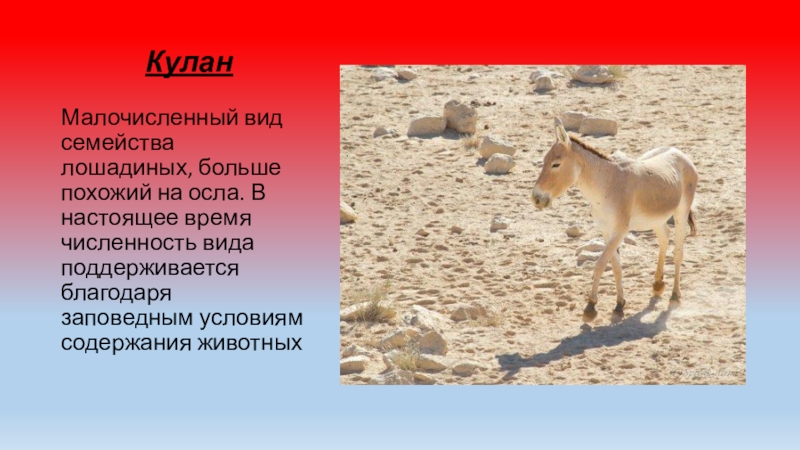 больше похожий на осла. В настоящее время численность вида поддерживается благодаря заповедным условиям содержания животных