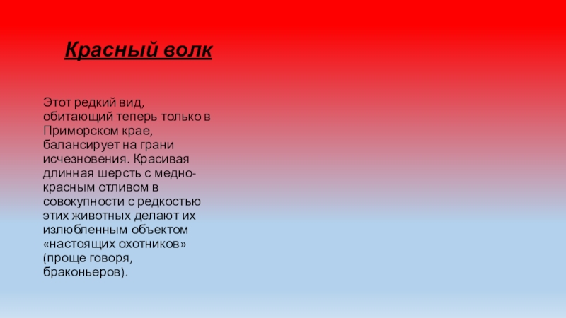 Приморском крае, балансирует на грани исчезновения. Красивая длинная шерсть с медно-красным отливом в совокупности с редкостью этих животных делают их излюбленным объектом «настоящих охотников» (проще говоря, браконьеров).