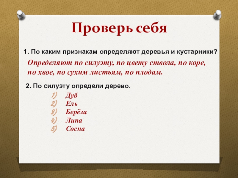 Определяют по силуэту, по цвету ствола, по коре, по хвое, по сухим листьям, по плодам.