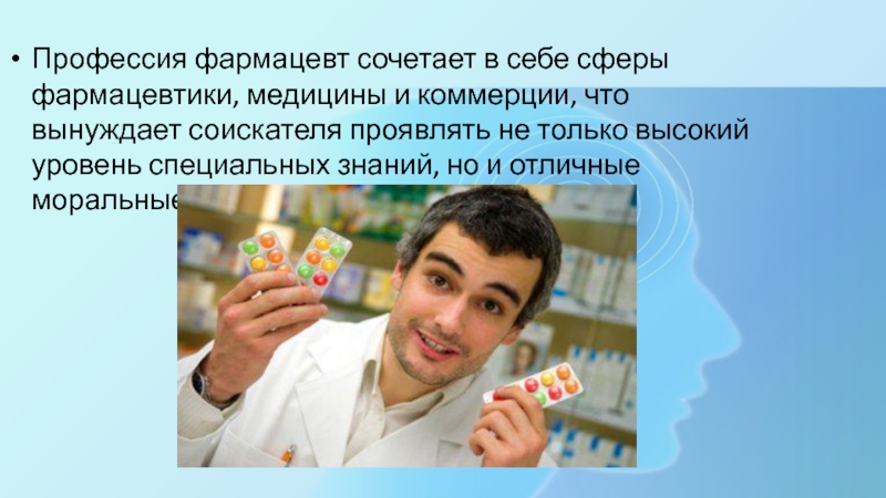 Слайд 7Профессия фармацевт сочетает в себе сферы фармацевтики, медицины и коммерции, что