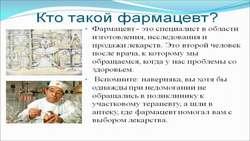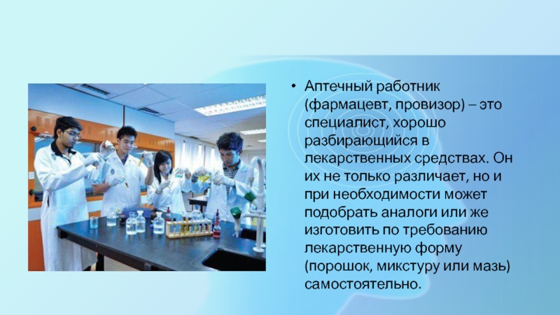 Слайд 4Аптечный работник (фармацевт, провизор) – это специалист, хорошо разбирающийся в лекарственных