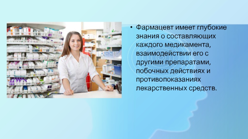 Слайд 6Фармацевт имеет глубокие знания о составляющих каждого медикамента, взаимодействии его с