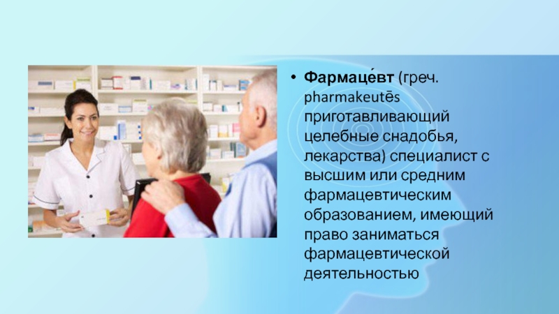 Слайд 3Фармаце́вт (греч. pharmakeutēs приготавливающий целебные снадобья, лекарства) специалист с высшим или средним