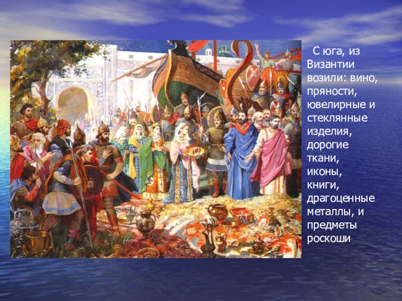 С юга, из Византии возили: вино, пряности, ювелирные и стеклянные изделия, дорогие ткани, иконы,