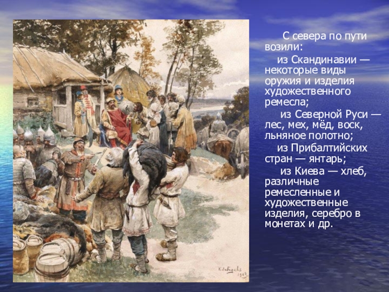 была Восточная Швеция. Далее вдоль северного побережья Балтийского («Варяжского») моря в Финский залив и устье Невы. Из Невы торговцы и путешественники попадали в Ладожские озеро и поднимались вверх по реке Волхов. Дальше торговый путь вёл по Волхову к Новгороду - оживлённому перекрёстку торговли. Из Новгорода купеческие суда шли по Ильмень-озеру, реке Ловать и её притокам, затем через волок (небольшое по расстоянию передвижение лодок по суше на деревянных катках) в Западную Двину и, минуя ещё один волок, в Днепр.