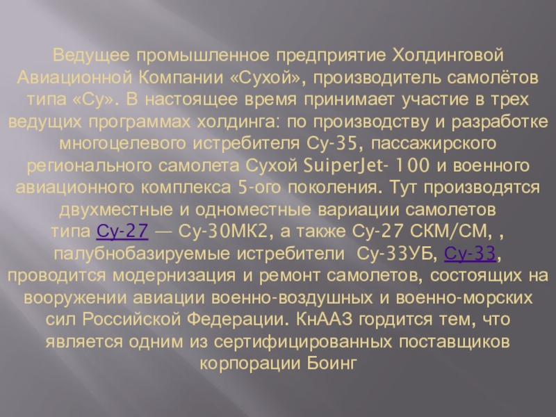 Слайд 8Ведущее промышленное предприятие Холдинговой Авиационной Компании «Сухой», производитель самолётов типа «Су».