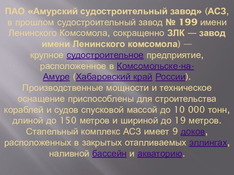 Слайд 4ПАО «Амурский судостроительный завод» (АСЗ, в прошлом судостроительный завод № 199 имени Ленинского Комсомола, сокращенно ЗЛК —