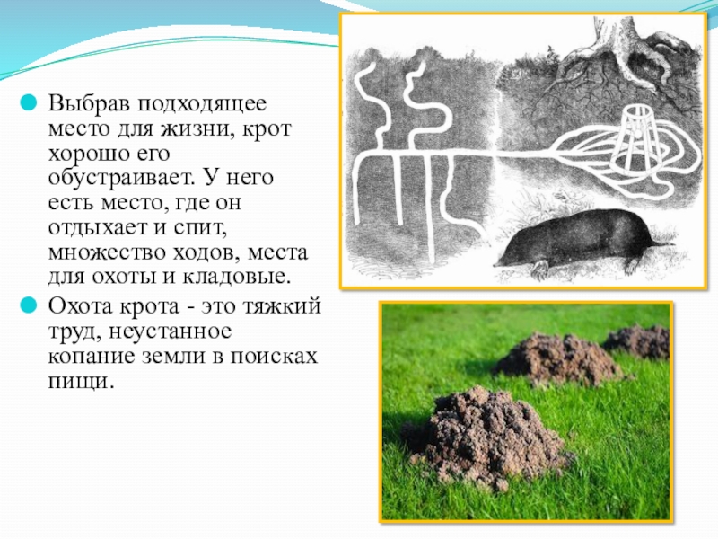 Слайд 6Выбрав подходящее место для жизни, крот хорошо его обустраивает. У него