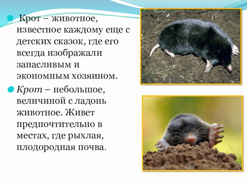 Слайд 3 Крот – животное, известное каждому еще с детских сказок, где