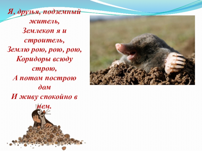 Я, друзья, подземный житель,Землекоп я и строитель,Землю рою, рою, рою,Коридоры всюду строю,А потом построю домИ живу спокойно в нем.