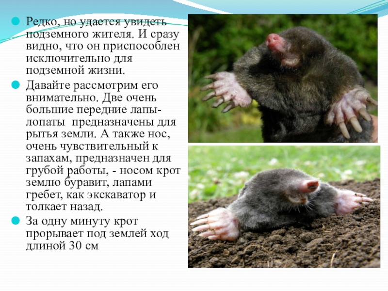 Слайд 4Редко, но удается увидеть подземного жителя. И сразу видно, что он