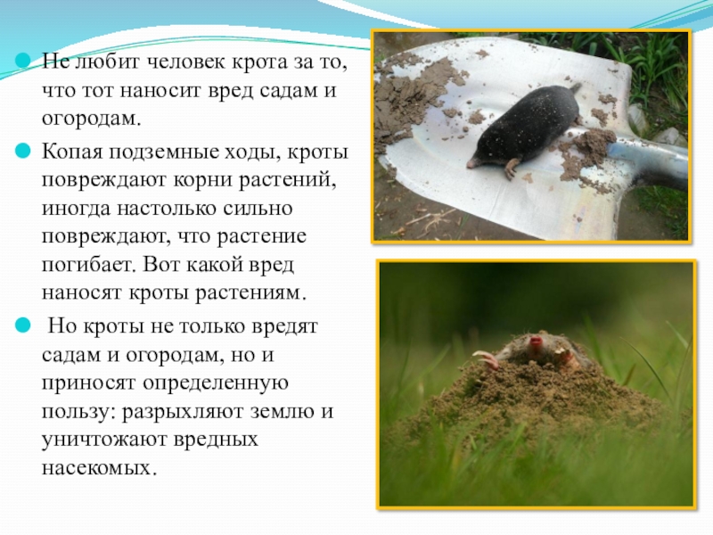 Слайд 9Не любит человек крота за то, что тот наносит вред садам
