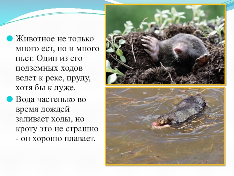 Вода частенько во время дождей заливает ходы, но кроту это не страшно - он хорошо плавает.