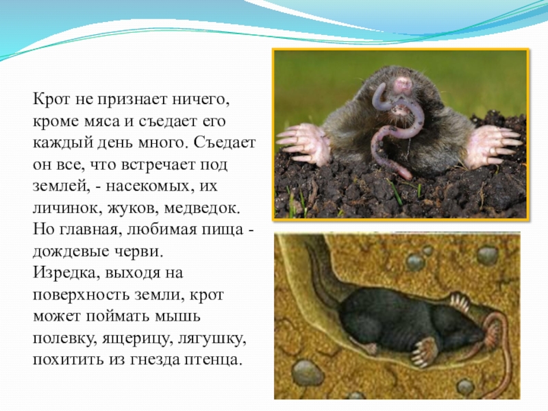Слайд 7Крот не признает ничего, кроме мяса и съедает его каждый день