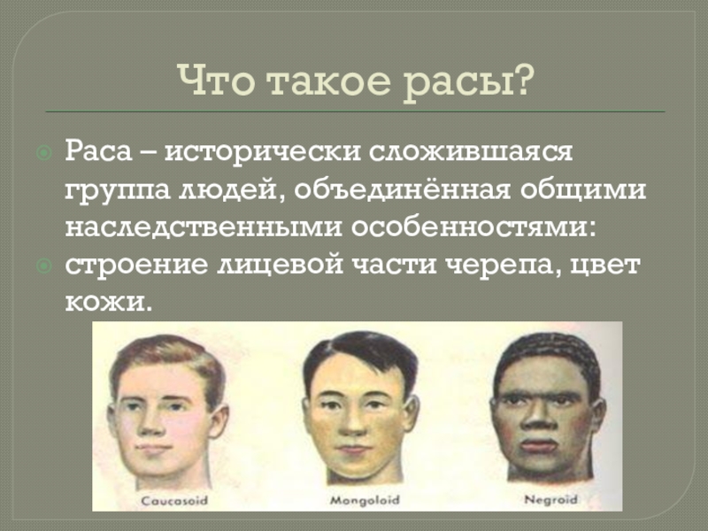 Что такое расы?Раса – исторически сложившаяся группа людей, объединённая общими наследственными особенностями:строение лицевой части черепа, цвет кожи.