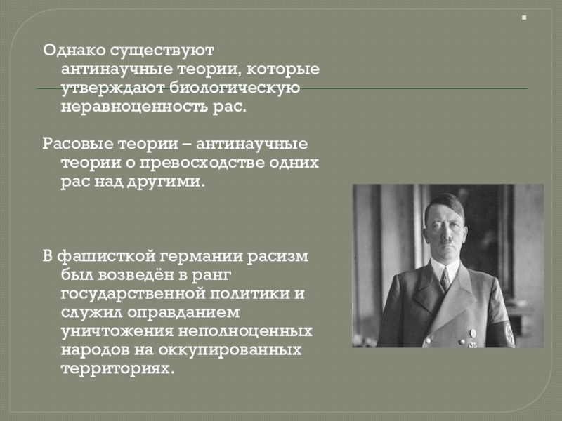 .Однако существуют антинаучные теории, которые утверждают биологическую неравноценность рас.Расовые теории – антинаучные теории о превосходстве одних рас