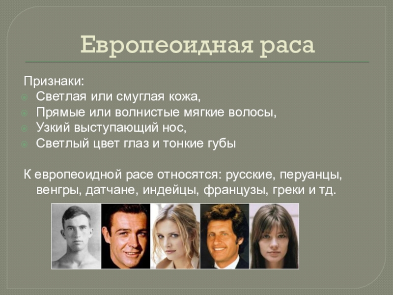 Европеоидная расаПризнаки: Светлая или смуглая кожа, Прямые или волнистые мягкие волосы,Узкий выступающий нос,Светлый цвет глаз и тонкие
