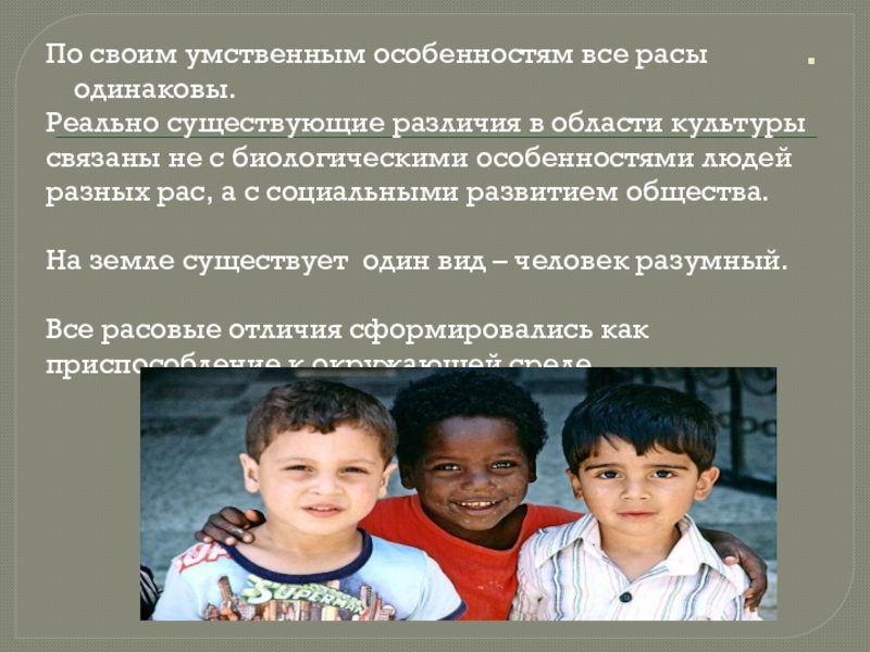 .По своим умственным особенностям все расы одинаковы.Реально существующие различия в области культуры связаны не с биологическими особенностями