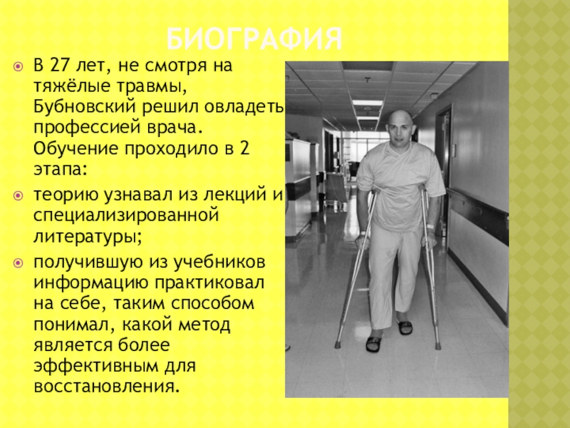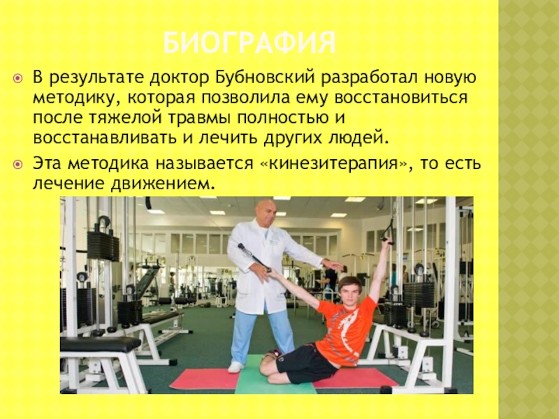 Биография В результате доктор Бубновский разработал новую методику, которая позволила ему восстановиться после тяжелой травмы полностью и